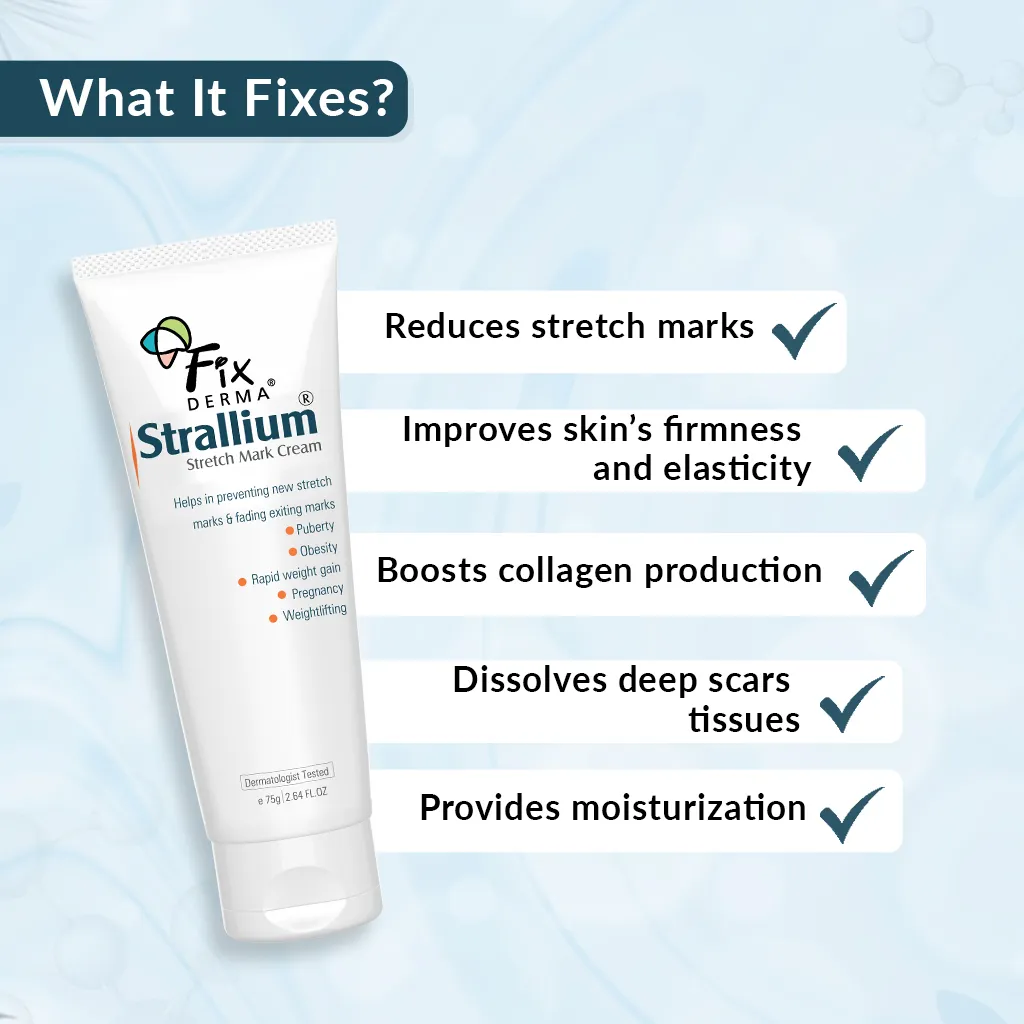 Fixderma Strallium Stretch Mark Cream is a special formulation curated to reduce stretch marks caused by pregnancy or intense physical workouts. Enriched with a unique blend of Red Algae Extract, Allium Cepa Extract, Vitamin B3, and powerful antioxidants, it helps nourish and repair the skin, fades the stretch marks, and promotes a smoother, healthier, confident appearance.