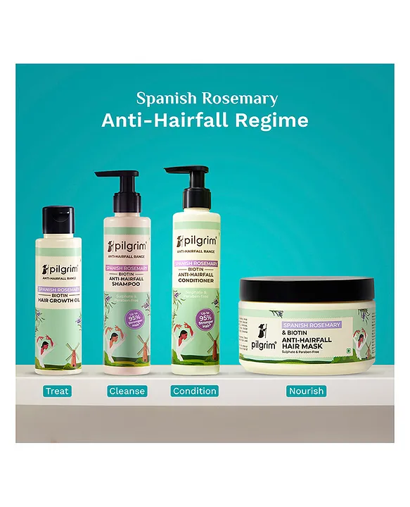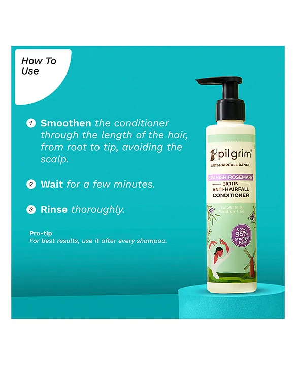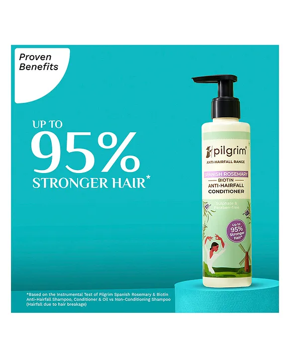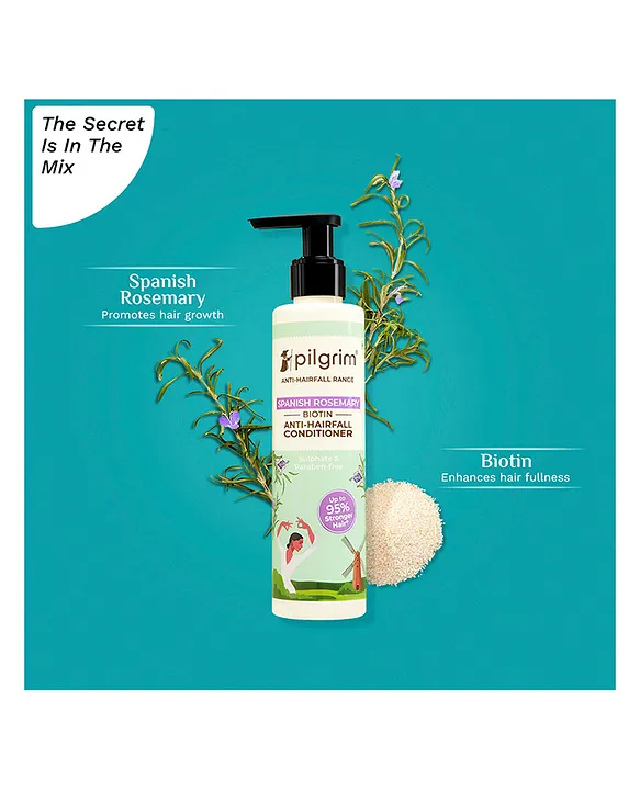Experience the ultimate haircare duo with our Spanish Rosemary & Biotin Anti-Hairfall Conditioner, the perfect companion to our anti-hairfall shampoo. This deeply nourishing conditioner strengthens hair by up to 95%, effectively reducing hairfall. (Based on the Instrumental Test of Pilgrim Spanish Rosemary & Biotin Anti-Hairfall Shampoo, Conditioner & Oil vs Non-Conditioning Shampoo; Hairfall due to hair breakage). Unlock the world beauty secret of Spanish Rosemary (Rosmarinus officinalis), a fragrant evergreen herb that thrives in the sun-soaked Mediterranean region. Known in Mediterranean cultures for its ability to address hairfall, its oil has been used in hair rituals for centuries. Made to fight hair fall due to breakage, our conditioner actively strengthens hair by preserving essential moisture within the hair shaft. The result? Sleek, manageable locks accompanied by an irresistible shine that reflects hair health. Infused with the potent antioxidant properties of Spanish Rosemary and Biotin, this formulation acts as a protective shield against environmental stressors. Enjoy the luxury of smoother, tangle-free hair that reflects strength and vitality with the Spanish Rosemary & Biotin Anti-Hairfall Conditioner.