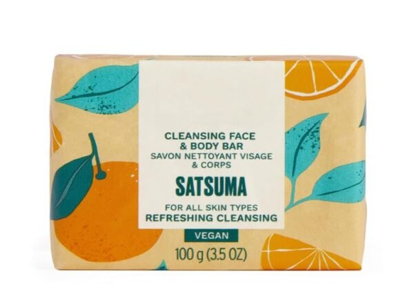 Feel soft, smooth and fresh with our new and improved Satsuma Cleansing Face & Body Bar – a more sustainable* soap bar with a high level of natural origin ingredients.Our new multi-tasking cleansing bar lets you lather up from head-to-toe and treat that face and body to some serious TLC. Rich and creamy, it leaves all skin types feeling cleansed and refreshed. Notes of orange and mandarin are sweet and energising, as if someone is peeling a ripe and juicy satsuma.